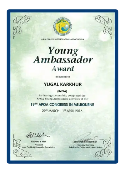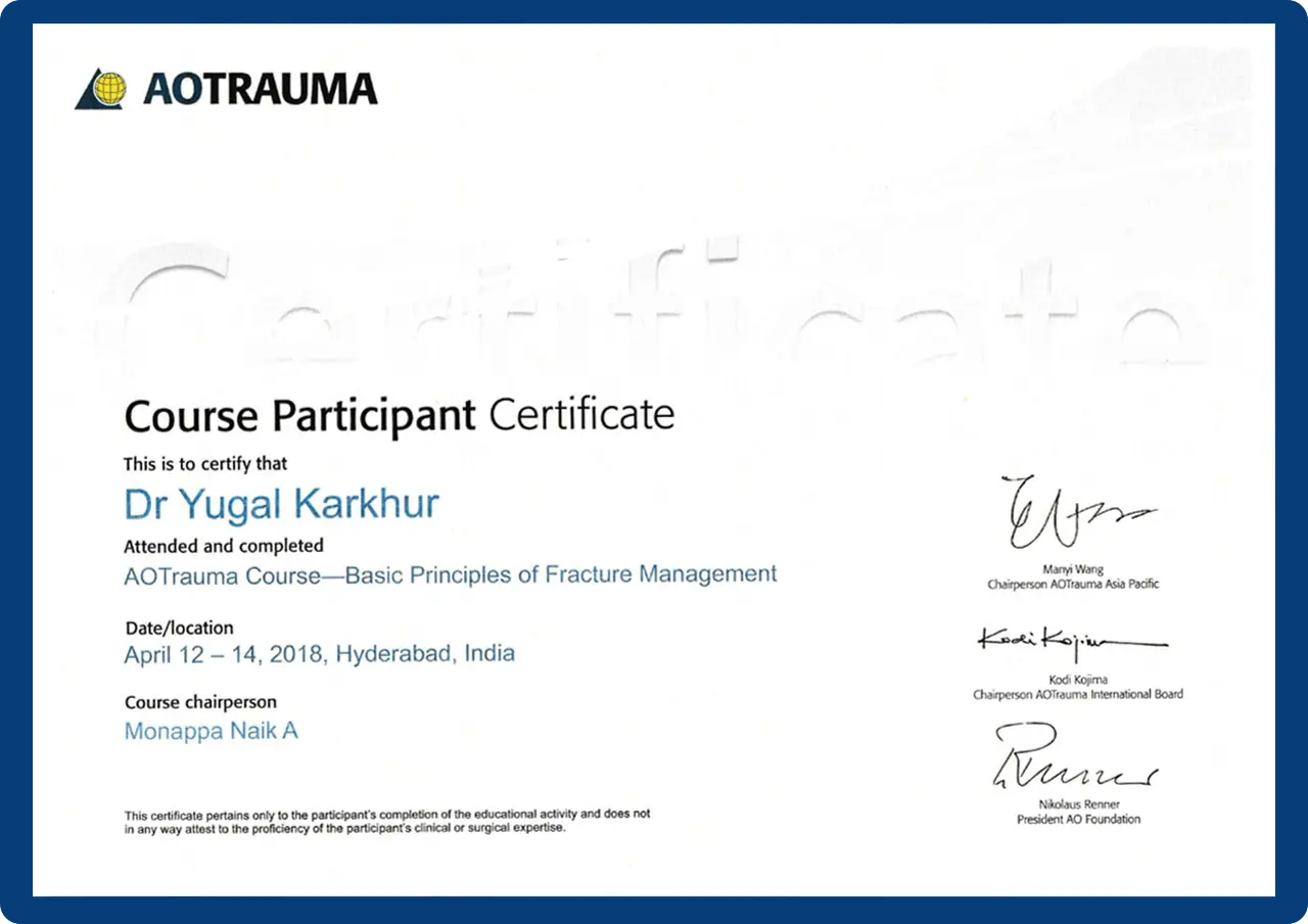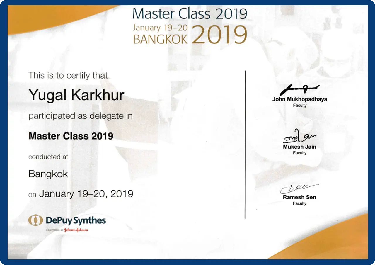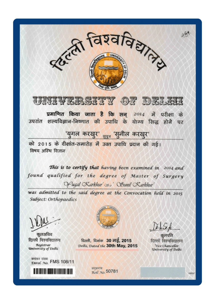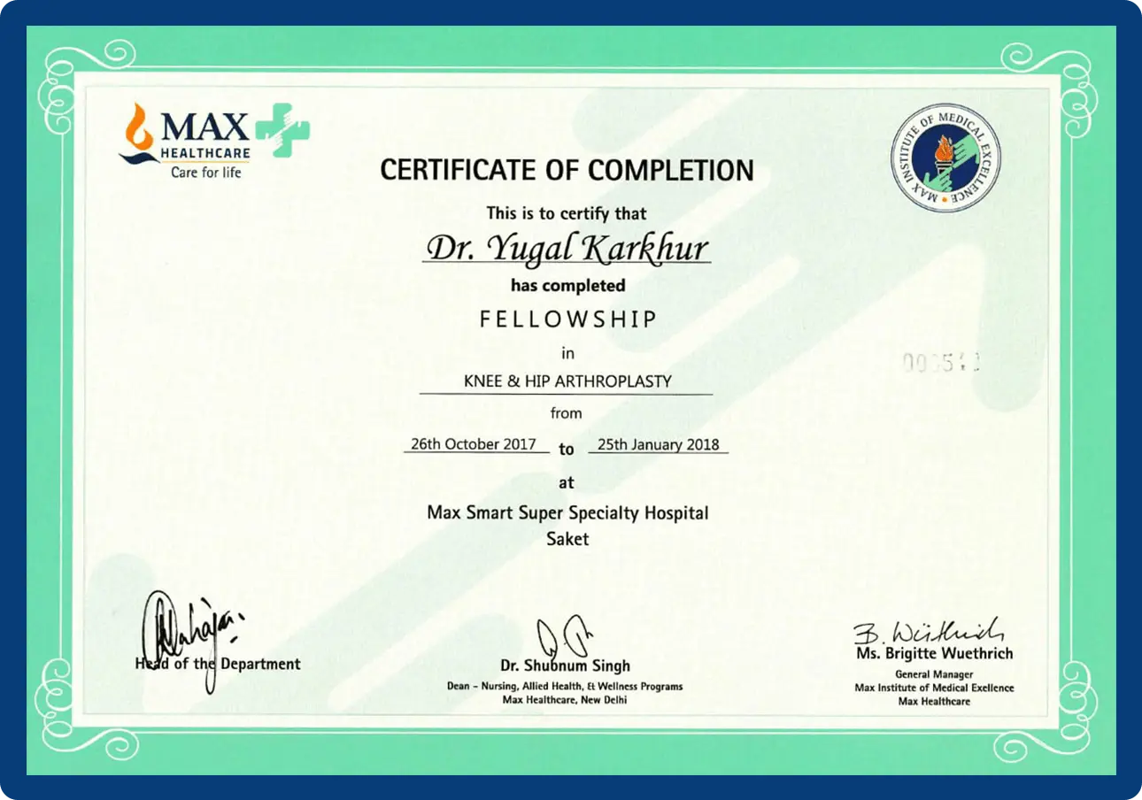 Dr. Yugal Karkhur has 14+ years of experience in Orthopaedics and Joint Replacement Surgery. He completed his MS (Orthopaedics) from Maulana Azad Medical College, New Delhi and served as Senior Registrar at Lok Nayak Hospital and Sushruta Trauma Centre.