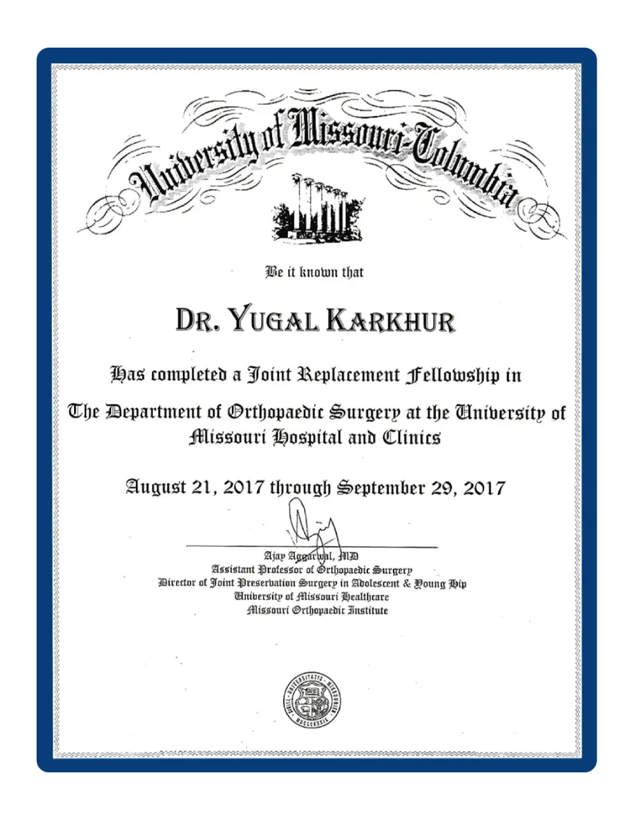 Dr. Karkhur is fellowship-trained in joint replacement and adult hip preservation surgery from Missouri Orthopaedic Institute (USA) and trained in arthroscopic knee & hip surgery at Safdarjung Hospital, New Delhi.